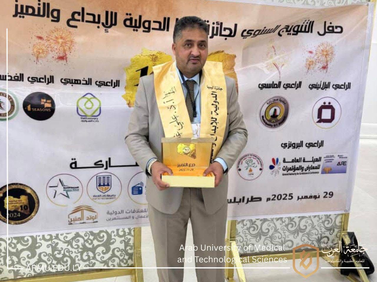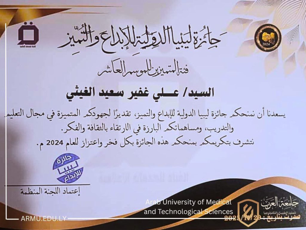 وتواصل جامعة العرب للعلوم الطبية والتكنولوجيا دعم التميّز الأكاديمي، وتشجيع الكفاءات العلمية، بما يسهم في الارتقاء بالعملية التعليمية وخدمة المجتمع على المستويين الوطني والدولي.