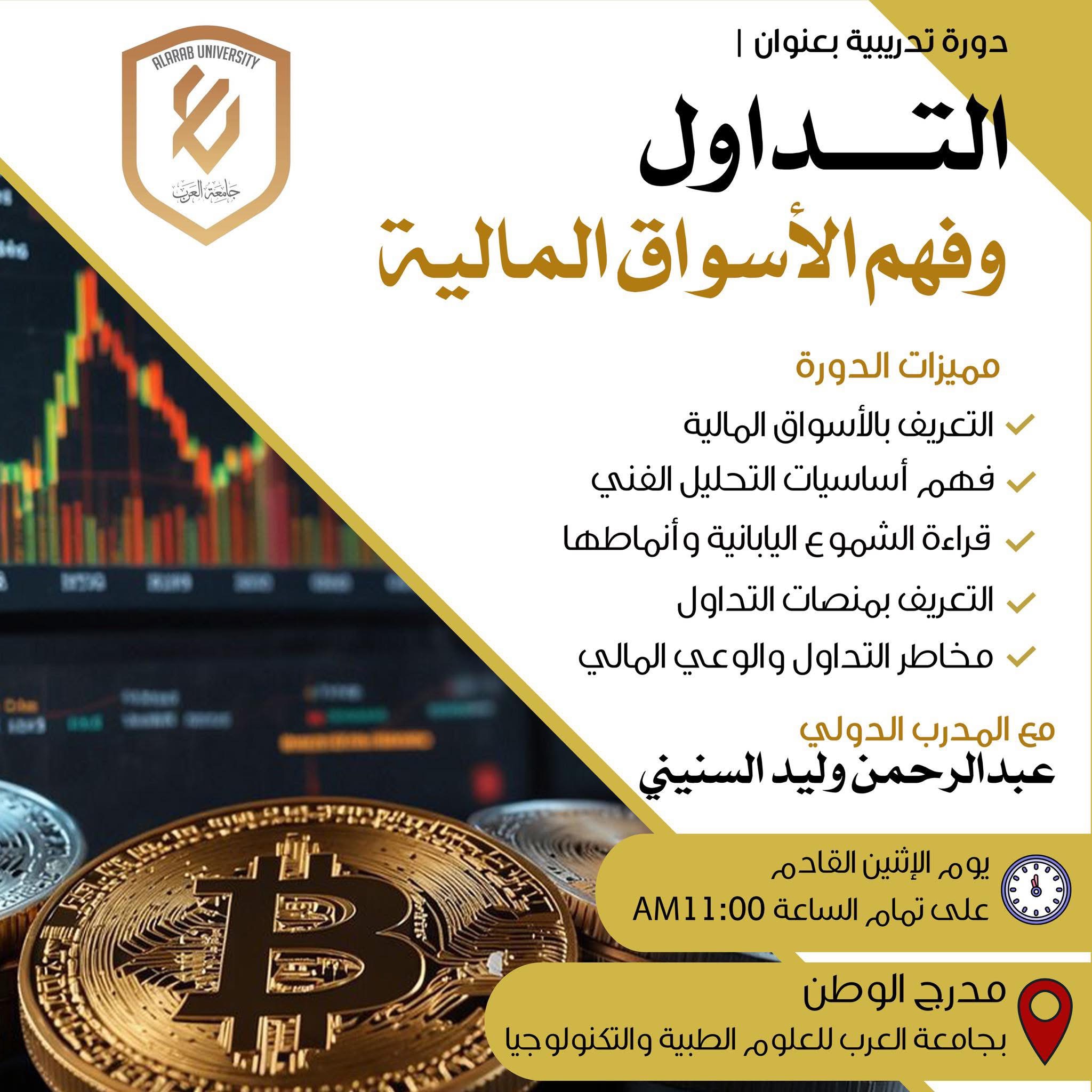ينظّم برنامج تكنولوجيا الإدارة بجامعة العرب للعلوم الطبية والتكنولوجيا دورة تدريبية مكثفة ليوم واحد بعنوان «التداول وفهم الأسواق المالية» وذلك في إطار حرص البرنامج على تعزيز الوعي المالي وتنمية المهارات الإدارية والاقتصادية لدى الطلبة والمهتمين.