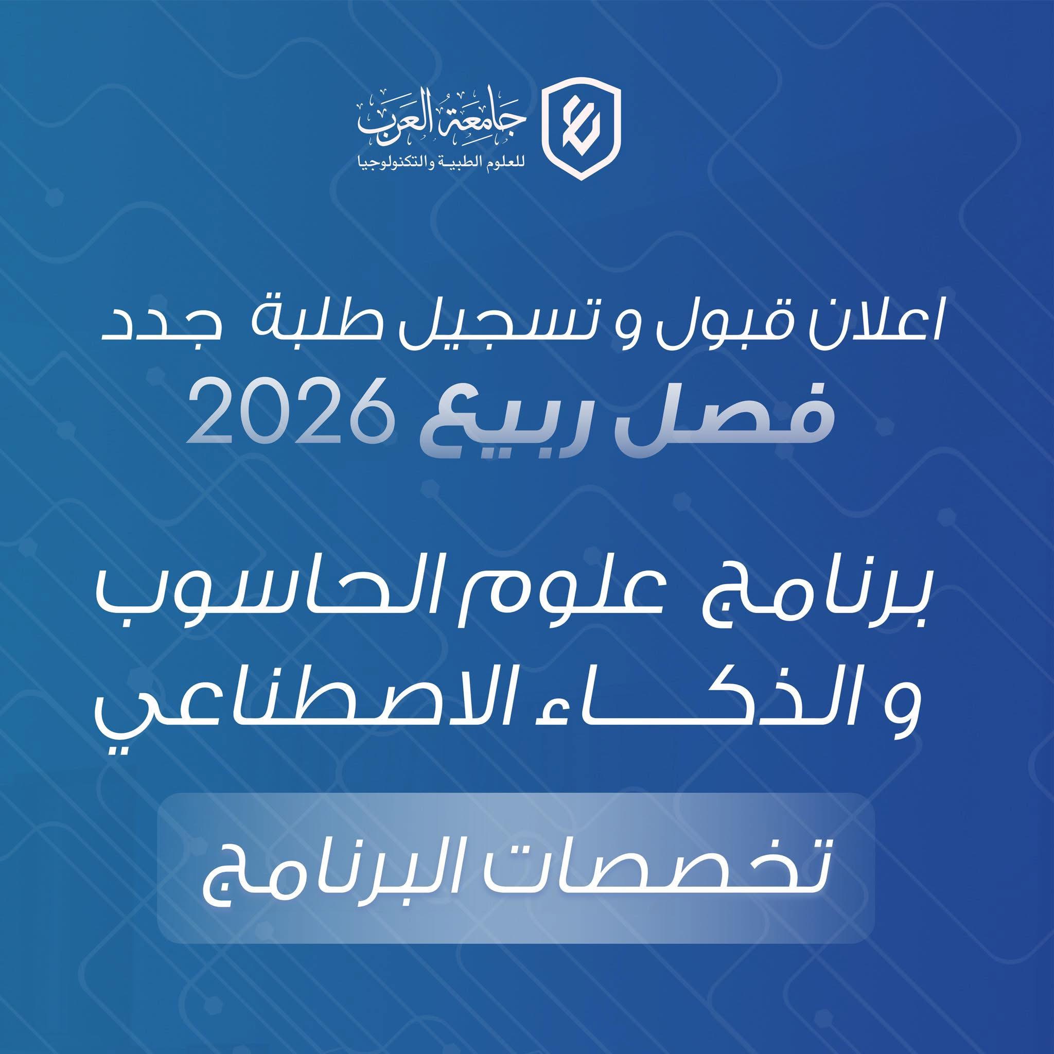 تُعلن جامعة العرب للعلوم الطبية والتكنولوجيا عن فتح باب القبول والتسجيل للفصل الدراسي ربيع 2026 في برنامج علوم الحاسوب والذكاء الاصطناعي، أحد البرامج الأكاديمية الحديثة المصممة لمواكبة التحول الرقمي ومتطلبات سوق العمل محليًا ودوليًا.
