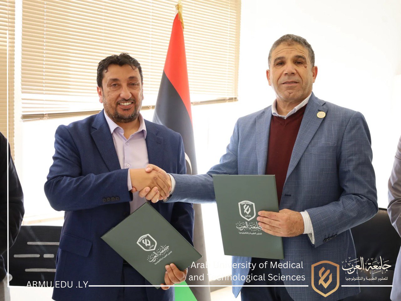 وقّع برنامج الهندسة المعمارية والتصميم الداخلي بجامعة العرب للعلوم الطبية والتكنولوجيا، اليوم، اتفاقية تعاون مع نقابة المهن الهندسية – بنغازي، بحضور رئيس نقابة المهن الهندسية الأستاذ محمد مبارك وأستاذ وليد الفارسي، وعدد من ممثلي النقابة والجامعة.